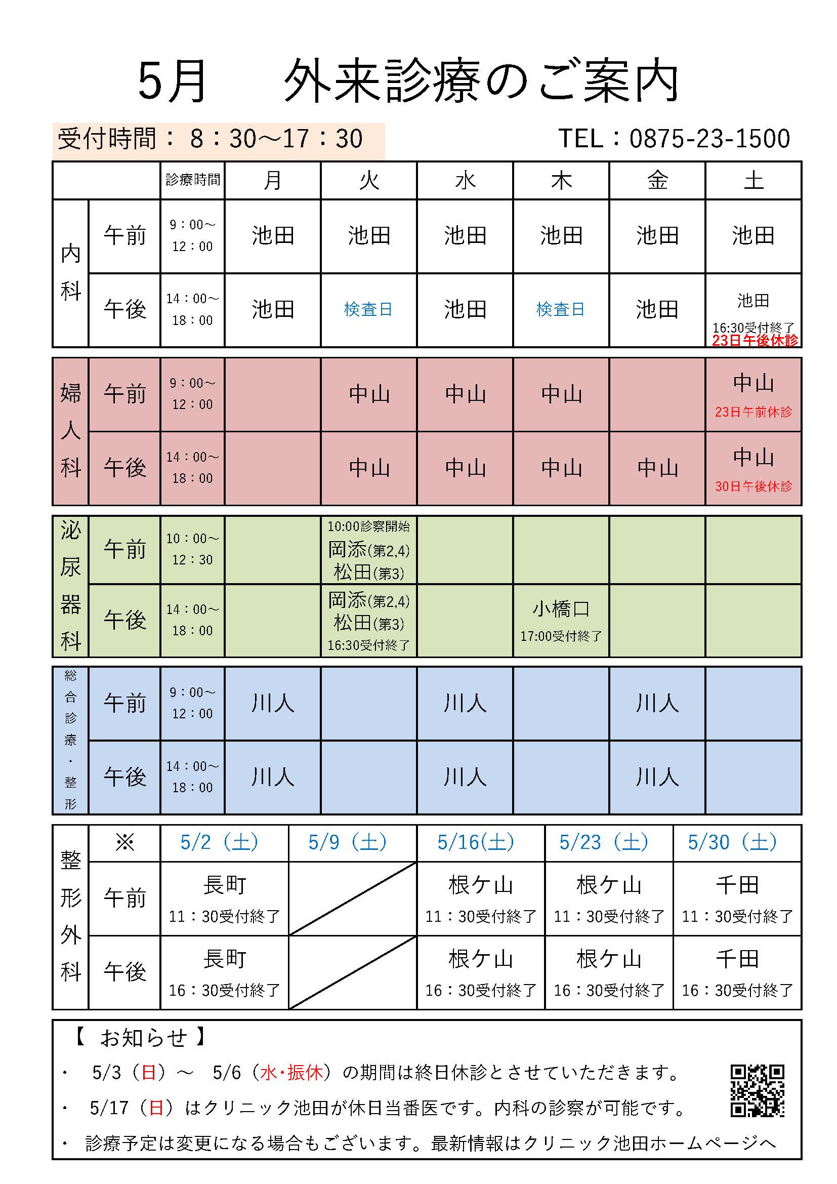 新着情報 25 4月 2026 診療案内 5月診療日案内 2026.04.25 iwata &... 2026年4月25日 26 3月 2026 診療案内 4月診療日案内 2026.03.26 iwata &... 2026年3月26日 29 7月 2025 未分類 施設基準一覧 2025.07.29 iwata 2025年7月29日 5 1月 2025 未分類 臨時休診のお知らせ 2025.01.05 iwata 1月6日(月)の内科診療は休診です。 整形外科は予定どおり診察をおこなっております。 ご迷惑をおかけ... 2025年1月5日 3 10月 2024 未分類 令和6年コロナワクチン接種 2024.10.03 iwata 2024年10月3日 3 10月 2024 未分類 インフルエンザワクチン 2024.10.03 iwata 2024年10月3日 3 6月 2024 未分類 長期処方・ 2024.06.03 iwata 2024年6月3日 24 4月 2024 未分類 プライバシーポリシー 2024.04.24 iwata 個人情報保護に関する基本方針 2024年4月24日 14 5月 2020 未分類 看護学生募集 2020.05.14 iwata 2020年5月14日 13 4月 2020 未分類 一般事業主行動計画の策定について 2020.04.13 iwata 2月26日付でメディカルクラブ大興和及び有限会社アコッドの一般事業主行動計画を策定しました。 行動計... 2020年4月13日 もっと見る 施設紹介 消化器内科・整形外科・リハビリテーション科 クリニック池田 クリニック池田 院長のご挨拶 MRI・CT・etc 人間ドック・健康診断 リハビリテーション 食事・栄養チーム 医療・福祉モール シークレストクリニカルモール モールのご案内 ネイル&エステサロン アコッド ギャラリーカフェ アコッド テナント医院のご紹介 グループ診療とは 開院募集 開院のお問い合わせ 介護複合型施設 大興和の杜 トップページ デイサービスセンター (通所介護事業) ショートステイ大興和 (短期入所生活介護事業) サービス付き高齢者向け住宅 大興和居宅介護支援事業所 デイサービスセンター結 (通所介護事業) ネイル&エステサロン Akode トップページ フェイシャル ネイル ボディ ドクターズコスメ キャンペーン ブログ アクセス MENU スタッフ採用情報 勤務医・開業医募集 介護サービス 人間ドック・生活習慣病予防健診 配食サービス イベントギャラリー cafe Akode フェイスブック クリニック池田